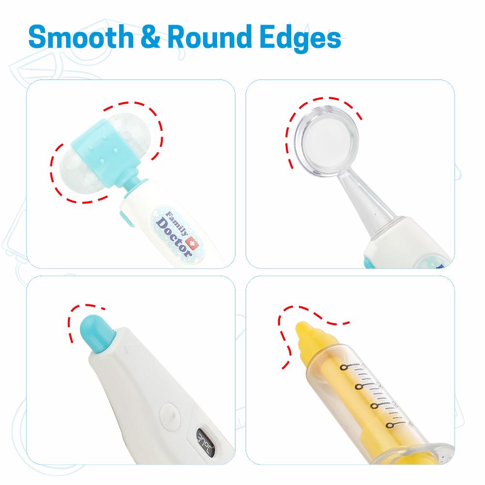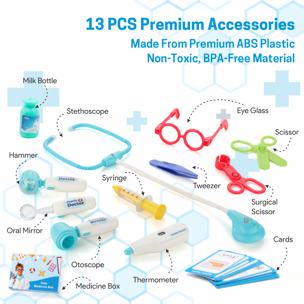 Made from non-toxic, BPA-free ABS and polypropylene plastic, this educational toy is durable, odor-free, and designed with smooth edges to ensure safe play. With 13 essential medical tools, children can role-play as doctors, understand body parts, and build empathy—helping reduce anxiety about real doctor visits in a playful, reassuring way.