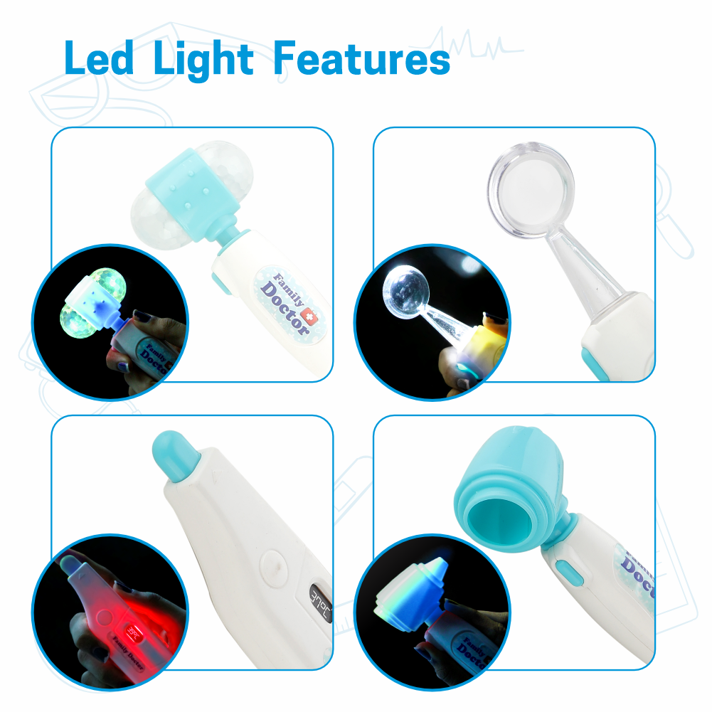 Equipped with realistic sound and light effects, the kit offers an immersive experience. The stethoscope produces a heartbeat sound, while tools like the hammer, thermometer, oral mirror, and autoscope light up during use. The pressable syringe adds another layer of realism, making this one of the most engaging doctor toys for imaginative play.