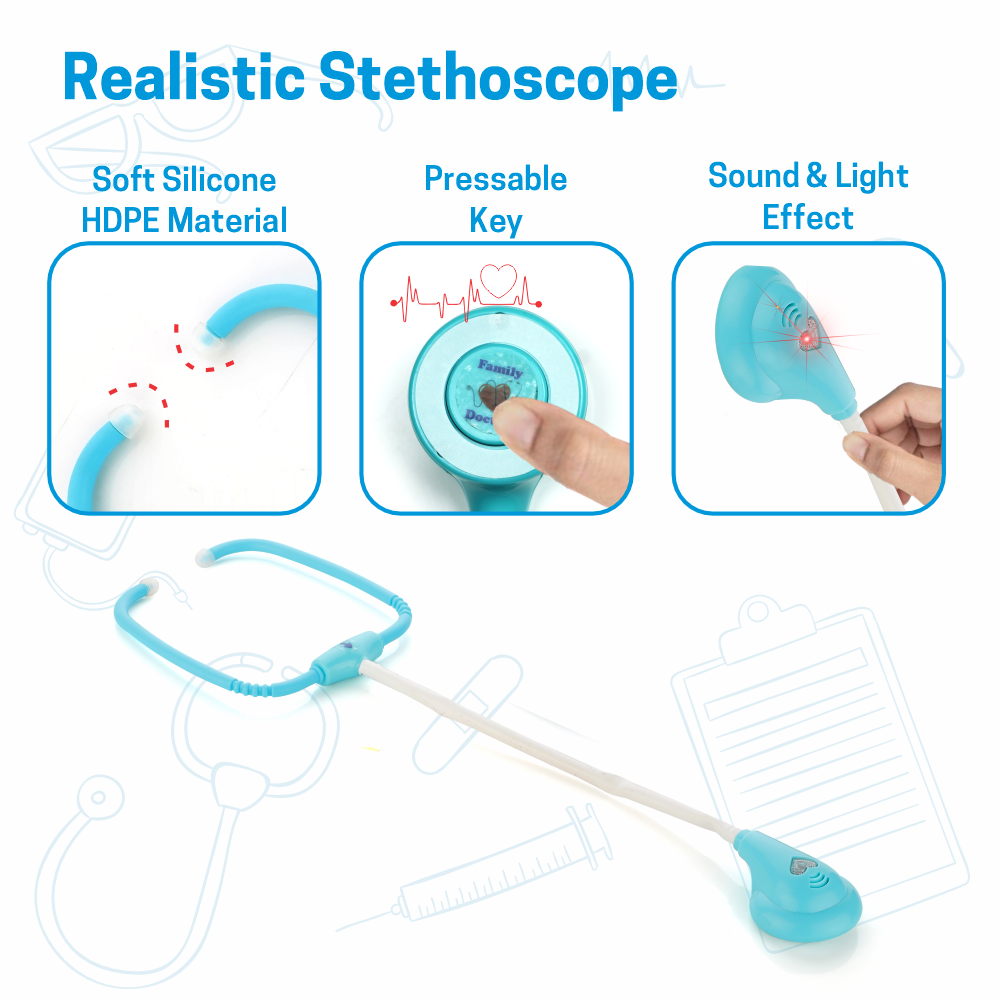 Heartbeat sound stethoscope, light-up medical tools, and a pressable syringe create an engaging, lifelike doctor play experience.