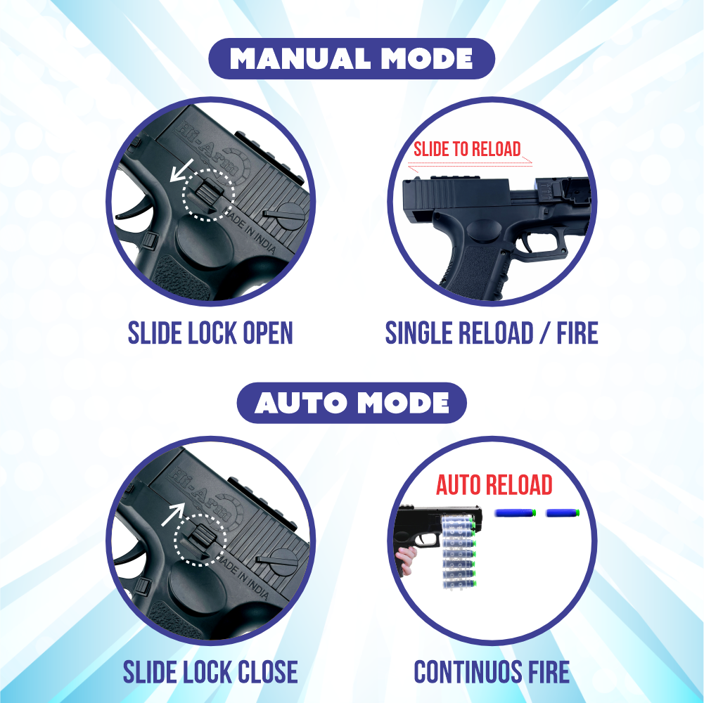 Manual Mode – Use slam fire action to shoot single bullets one at a time.