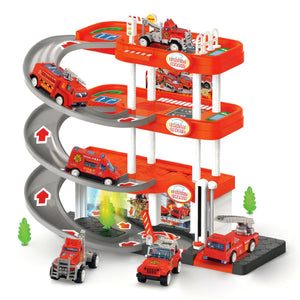 3-Level Parking Garage With Sliding Track : Children Can Race Their Fire Trucks Down The Spiral Ramps From Floor To Floor In This Multi-Level Playset, Adding Fast-Paced Fun To Fire Rescue Missions.