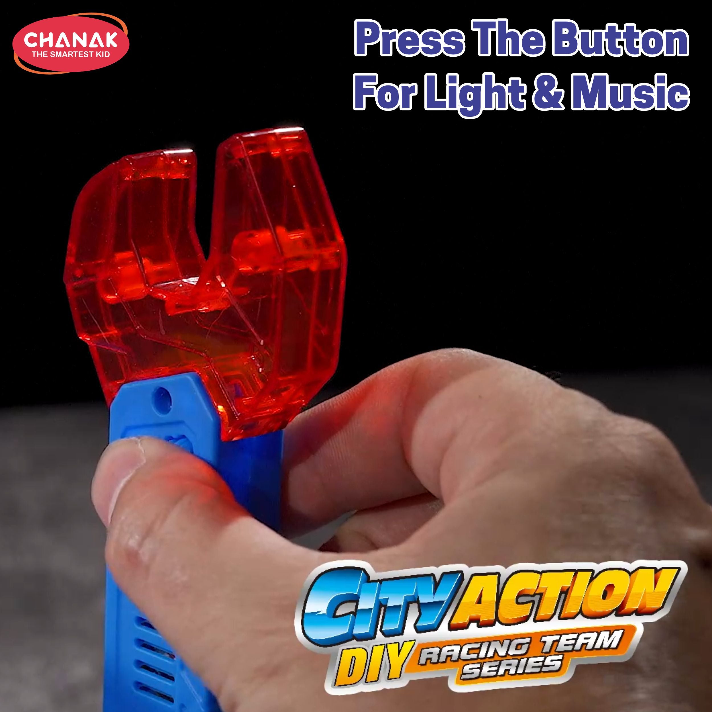 Chanak City Action Diy Racing Team Toolbox Trans shape Playset This Innovative 2-In-1 Toy Magically Unfolds From A Handy Carry Toolbox Into A Full-Fledged Racing Station With Realistic Lights And Sounds. Kids Can Launch Cars Using The Catapult, Drive Through Ramps, Refuel At The Gas Station, And Fly The Helicopter For Rescue Missions. Designed For Easy Portability And Hours Of Imaginative Play, It’s Built With Safe, Durable Materials And Includes Two Die-Cast Vehicles And A Helicopter. Whether At Home Or On The Go, This Multi-Function Playset Is Perfect For Curious Little Engineers And Racing Enthusiasts Alike