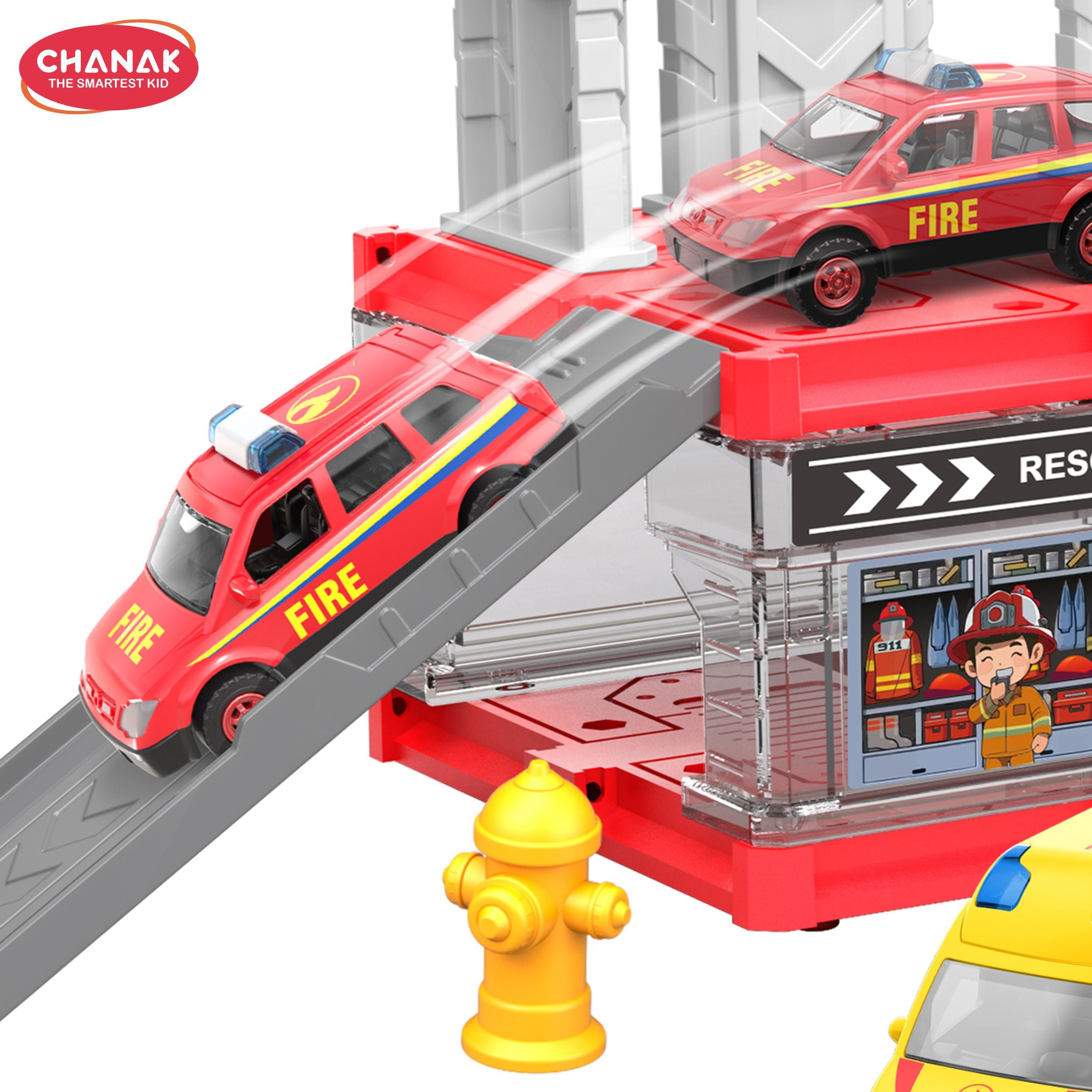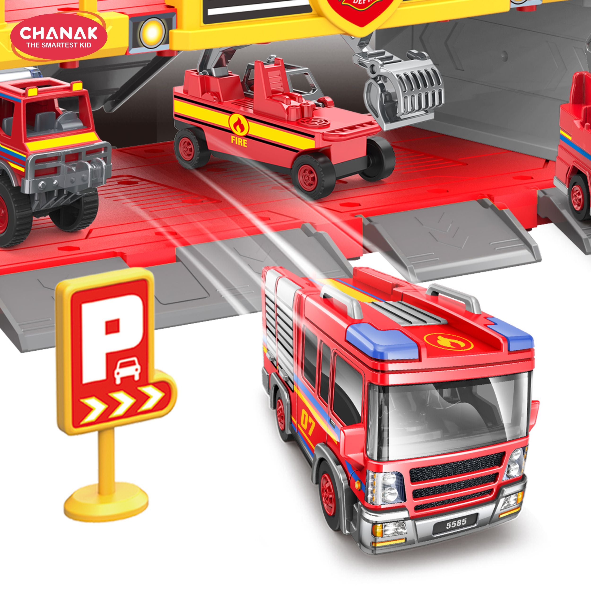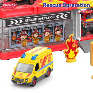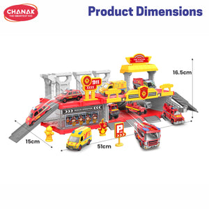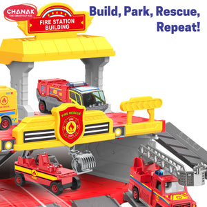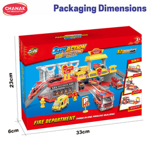 Chanak Fire Department 3-In-1 Parking Building Playset For Kids | Multi-Level Fire Station With Sliding Ramp, Die-Cast Fire Truck, And Rescue Accessories | Easy Assembly | Educational Toy For Boys & Girls