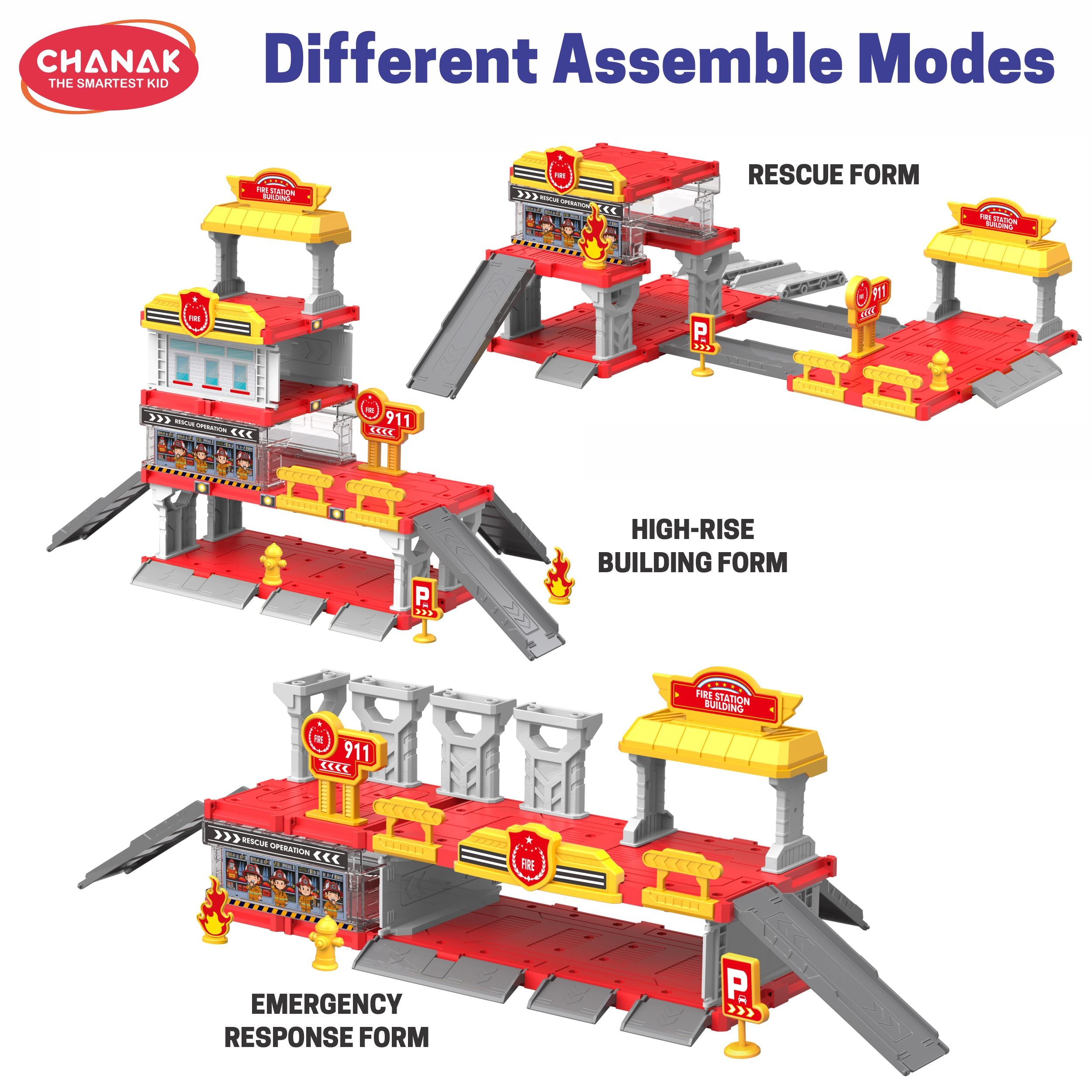 Chanak Fire Department 3-In-1 Parking Building Playset, A Thrilling Rescue Adventure That Blends Fun And Learning! This Multi-Level Fire Station Set Lets Kids Build And Play In Three Different Assembly Modes — High-Rise Building, Rescue Form, And Emergency Response Base. With Its Sliding Ramp, Multiple Parking Spots, And Realistic Fire Department Theme, It Gives Children Endless Opportunities To Act Out Heroic Missions. The Included Die-Cast Fire Vehicle Adds A Touch Of Realism, While Easy-To-Assemble Parts Ensure Quick Setup For Nonstop Play. Designed With Bright Colors, Durable Plastic, And Smooth Edges, This Playset Enhances Motor Skills, Creativity, And Imaginative Storytelling — Perfect For Little Heroes In Training