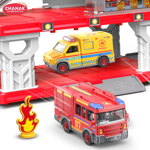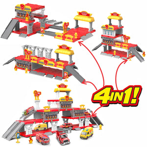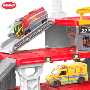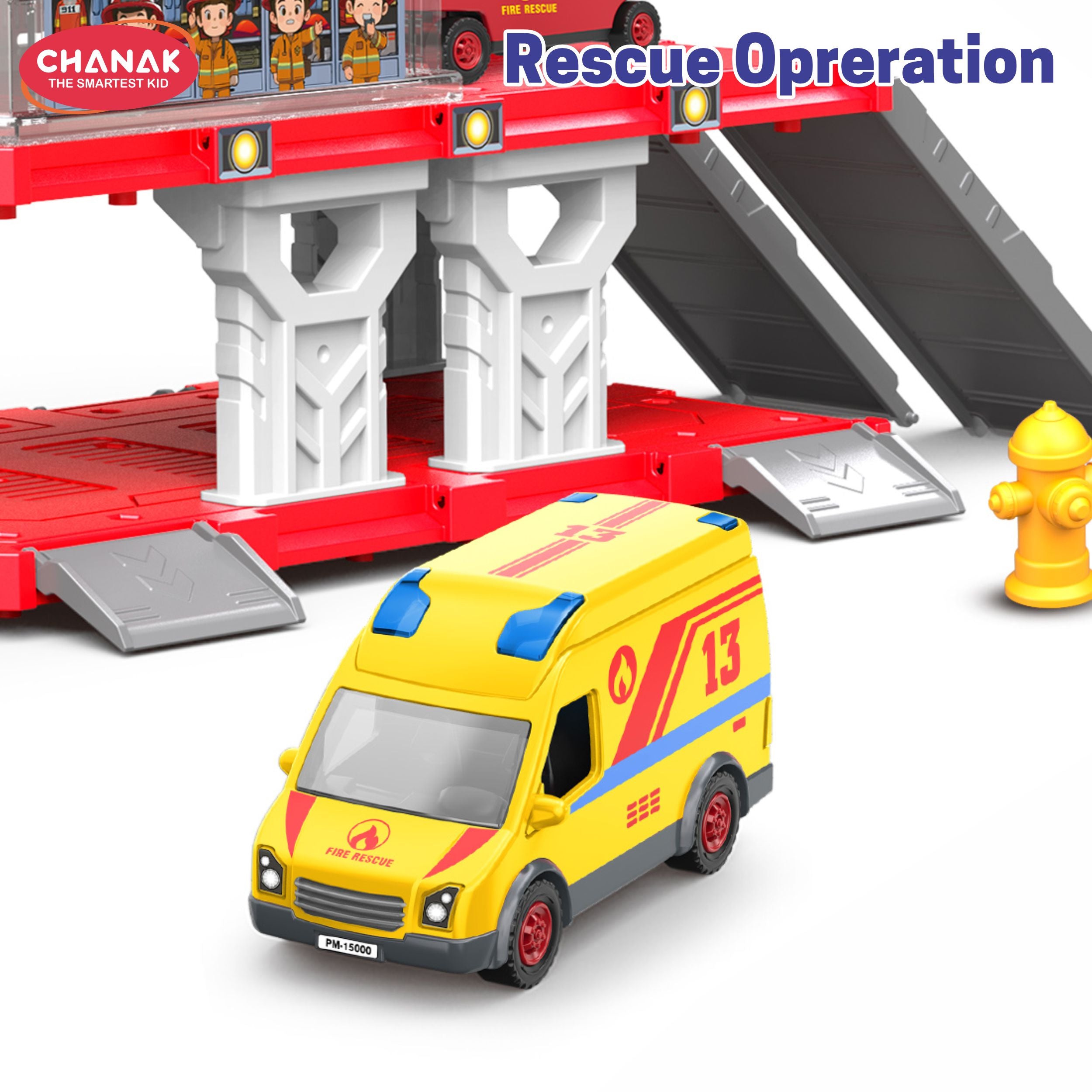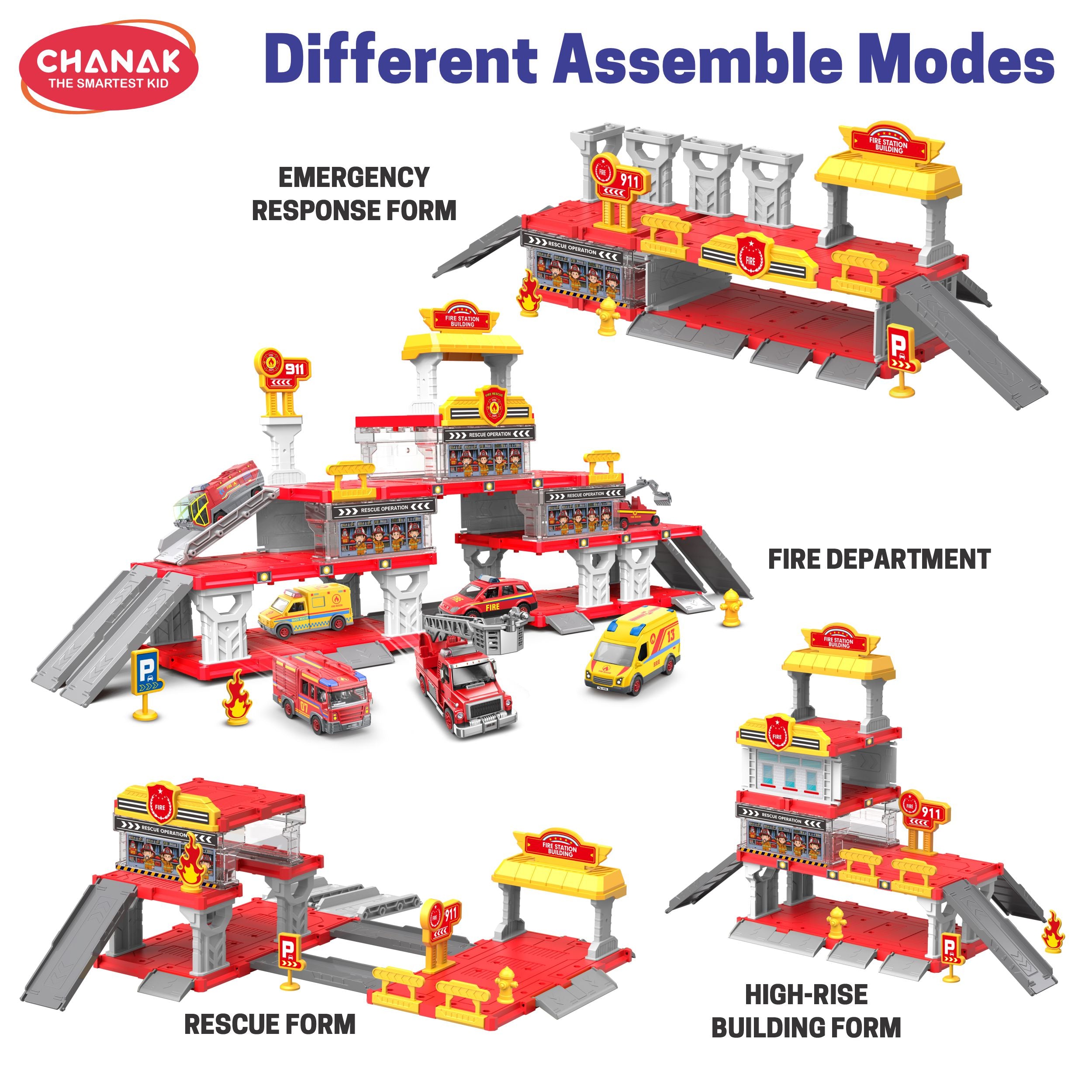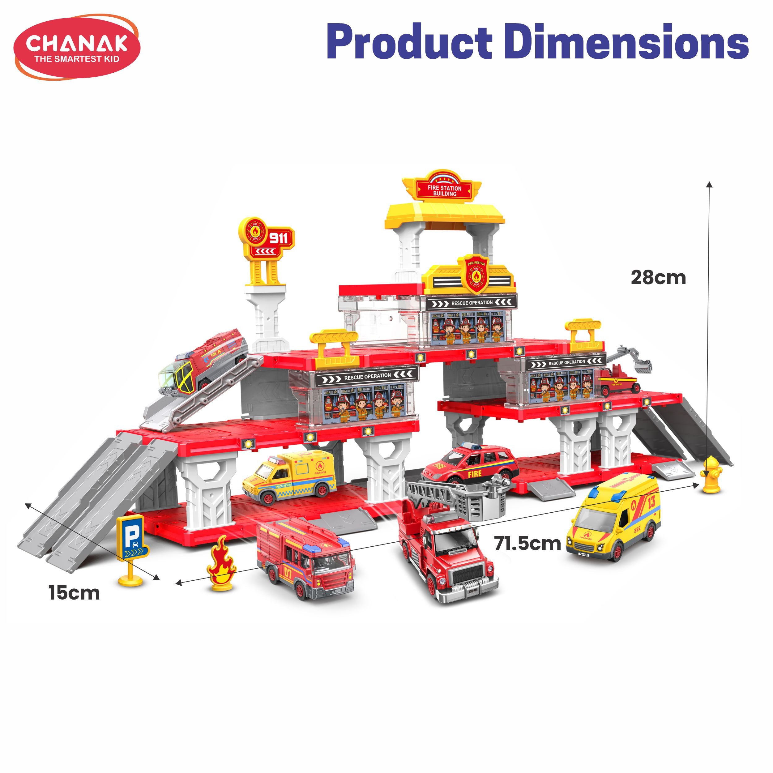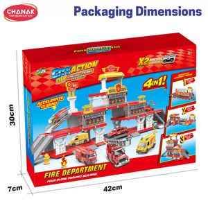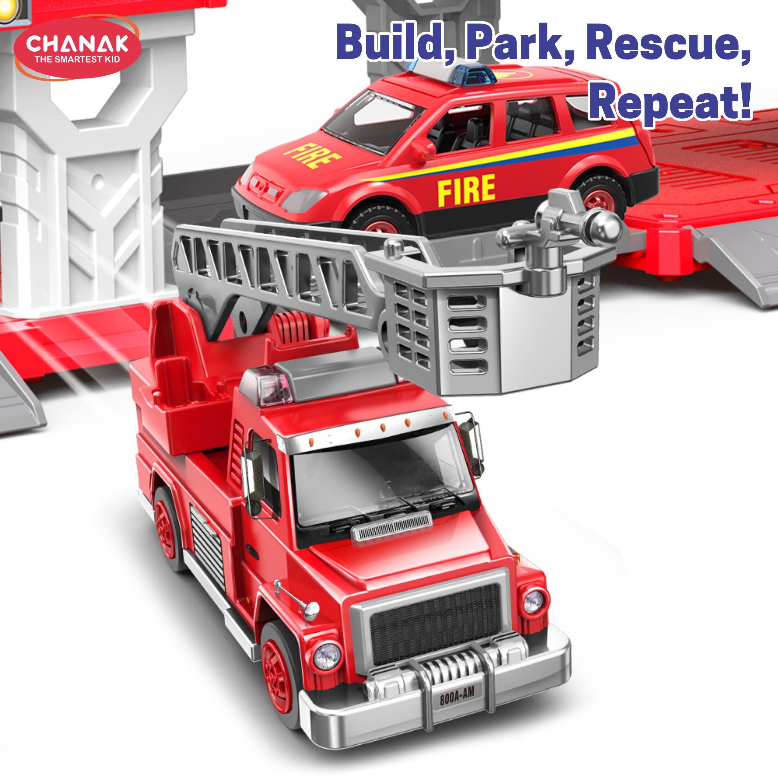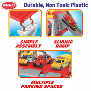 Chanak Fire Department 4-In-1 Parking Building Playset For Kids | Multi-Level Fire Station With Sliding Ramps, 2 Die-Cast Vehicles & Rescue Accessories | Easy Assembly | Educational Toy For Boys & Girls