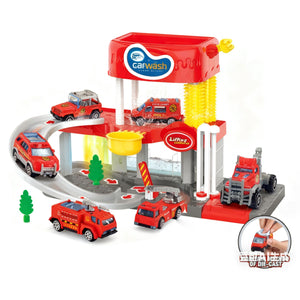 1N - Two-Layer Car Wash Station 2N - Alloy Fire Trucks 1N - Water Tank & Sprayer System 2N - Rotating Cleaning Brushes And Foam Wash Pipe 1N - Manual Lift Platform 2N - Decorative Accessories Trees/Sign Boards 1N - Easy Assembly Instruction Manual