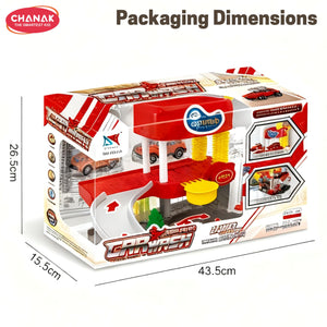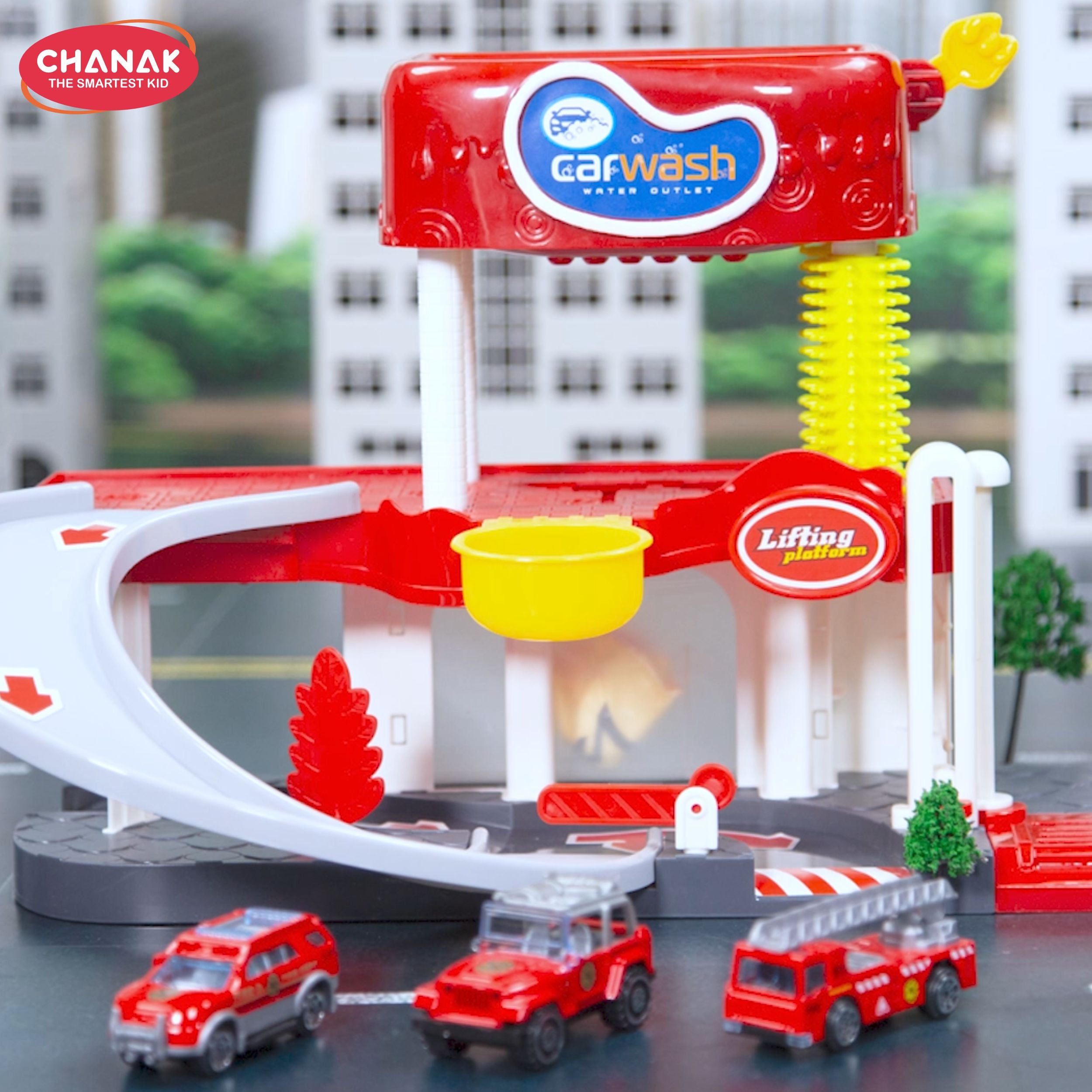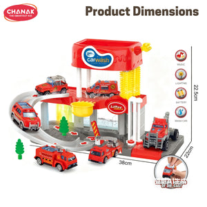 Chanak Fire Truck Car Wash Playset For Kids | 2-Layer Sliding Track With Lights, Music & Sound | Simulated Water Wash, Lifting Platform & Alloy Die-Cast Vehicles | Educational Toy For Boys & Girls (Ages 3+)