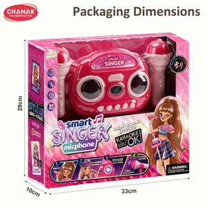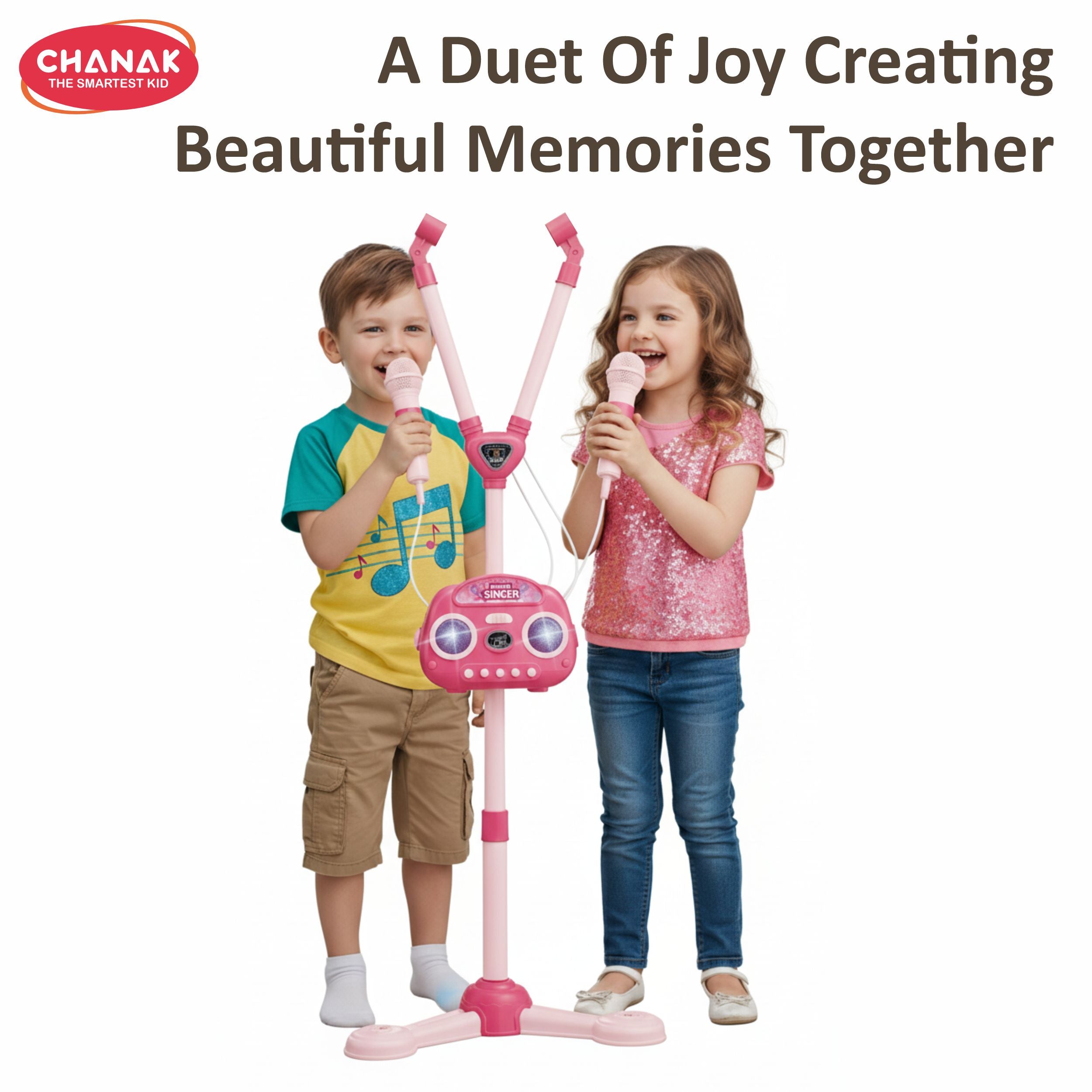 Chanak Smart Singer Karaoke Microphone Set! Designed With Two Microphones, It Allows Kids To Sing Together And Enjoy An Authentic Karaoke Experience. The Built-In Bluetooth Speaker Plays Music Directly From Your Phone Or Device, While The Colorful Led Lights Flash To The Beat, Adding Excitement To Every Performance. With Multiple Sound Effects, Easy-To-Use Controls, And Rechargeable Battery, This Karaoke Stand Is Perfect For Endless Entertainment. Its Adjustable Height Ensures Comfortable Use For Growing Kids. A Great Way To Encourage Confidence, Creativity, And Musical Skills In Children Aged 3 Years And Above. Whether It’s For Birthdays, Parties, Or Daily Fun — The Chanak Smart Singer Brings Music, Lights, And Laughter To Every Room!
