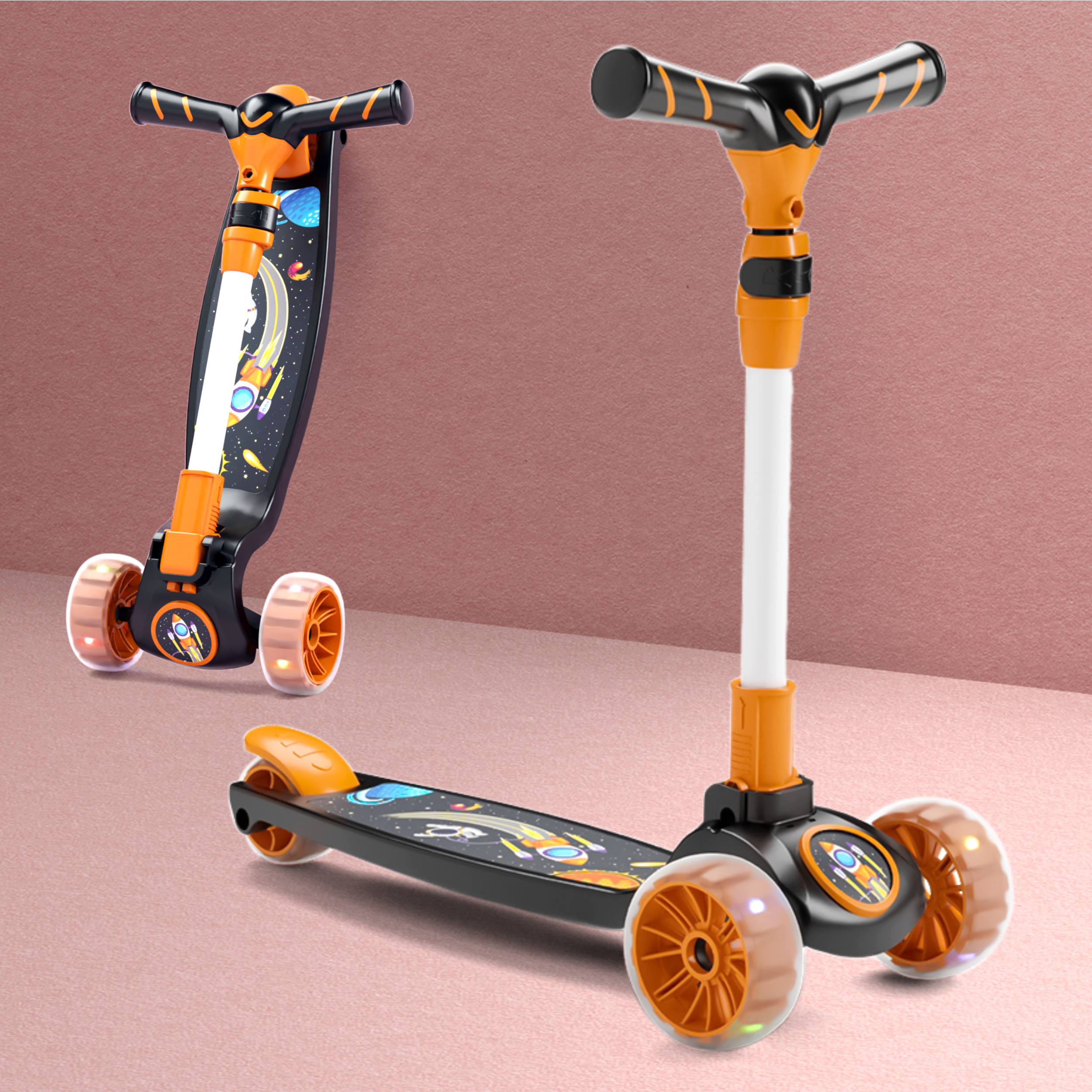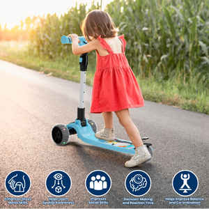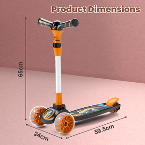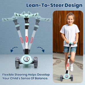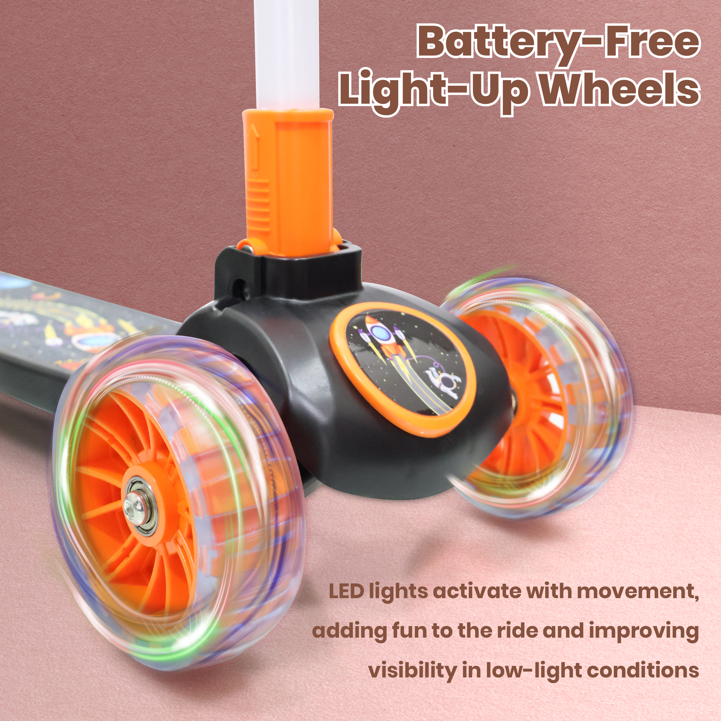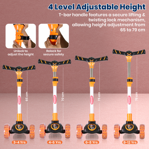 The scooter features 4 height-adjustable handlebars with a secure twisting safety lock, ensuring a comfortable fit as kids grow taller. Its durable and sturdy construction, along with an extra-wide reinforced deck, provides excellent balance and stability for confident riding. The SUV-style wheels with light-up effects add extra excitement while supporting smooth movement and rollover prevention during outdoor play.