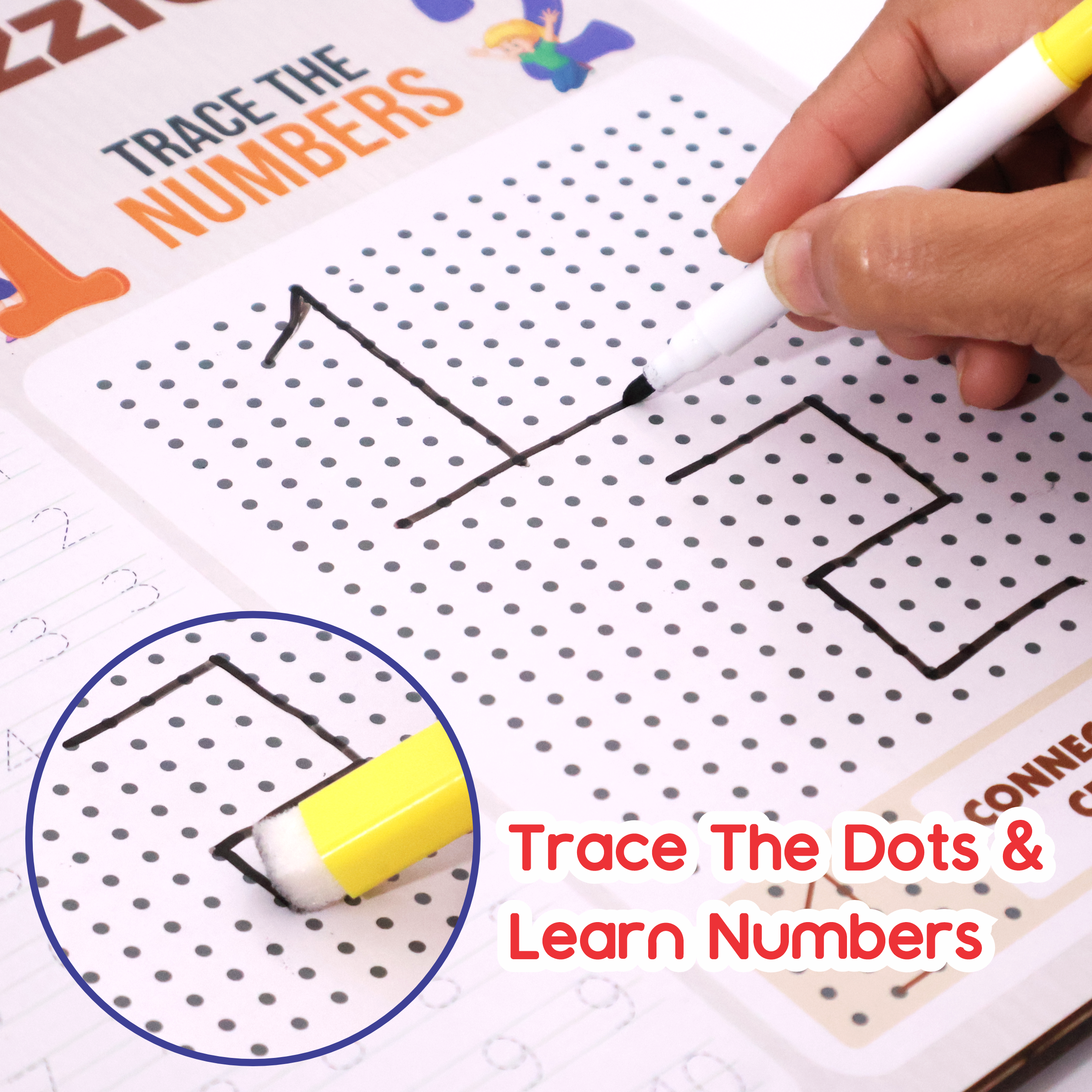 DOT-TO-DOT NUMBER FORMATION - Designed to reinforce number recognition and counting skills, this feature encourages children to connect the dots to complete number shapes. By following the dot patterns, kids develop a better understanding of number sequencing, spatial awareness, and logical thinking, strengthening their early numeracy skills.